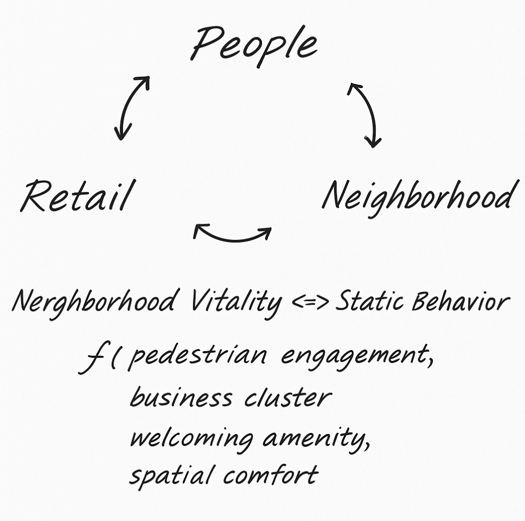 Trained in strategy consulting, I initially framed this work through supply and demand—connecting stores with consumers. Observation quickly revealed the limits of this economic lens, prompting me to study street-level behavior and translate human interactions into variables for systematic analysis and urban modeling.