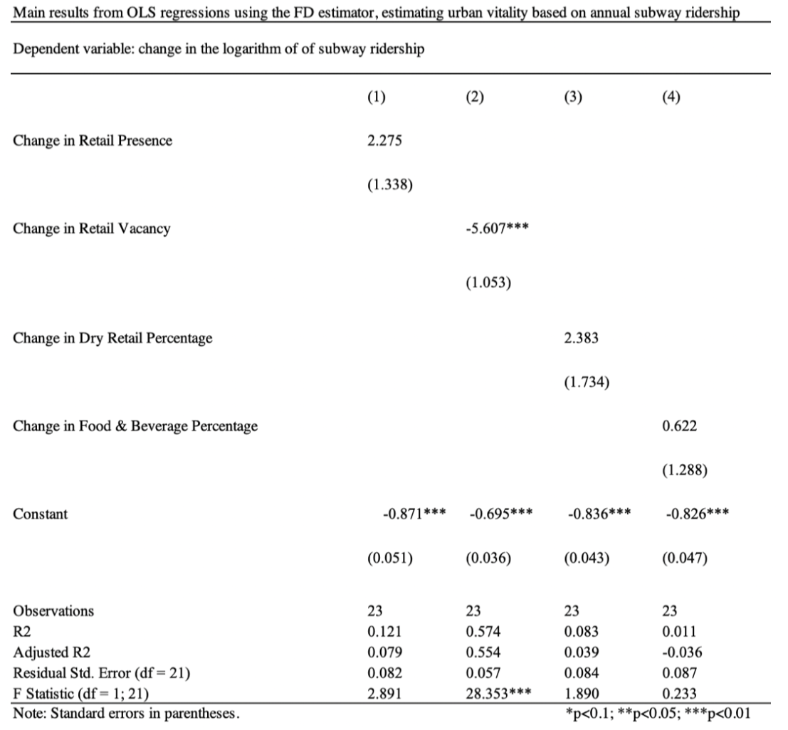 The primary objective of this research project is to investigate how changes in retail developments, including its presence, vacancy, and business compositions, shapes New York City. By regressing the change in retail development between 2021 and 2019 with the logarithm change in subway ridership, the coefficient should reveal if the association between the independent variable and dependent variable is positive or negative. Data for 2019 and 2021 are collected from various data sources and will be used to calculate the difference between the time period for all independent variables and the dependent variable. Through regression analysis, this study aims to investigate the distinct effects of four independent variables on subway ridership in relation to neighborhood vitality during the period of the COVID-19 pandemic's impact on the retail environment of New York City. The utilization of a first-differenced regression model in this research is not aimed at forecasting future changes in subway ridership but rather to facilitate the comparison of coefficients of interest.
