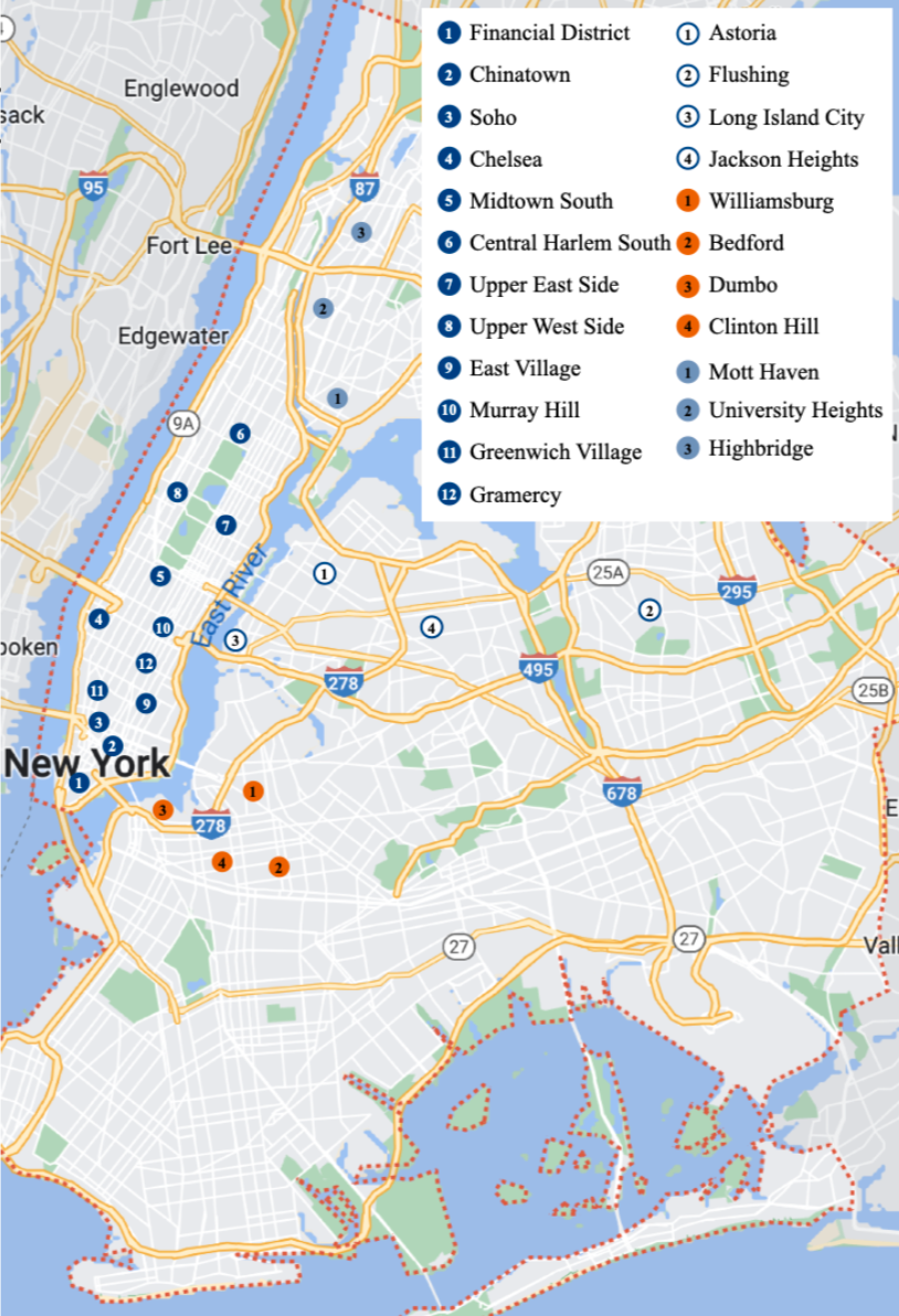 Selecting neighborhoods: The neighborhoods were first identified using the New York City Council’s Vacant Storefronts report (2020), which compiles ground-floor retail data from the Department of Finance (DOF). To refine this list, I incorporated MNS Real Estate’s commercial market reports to prioritize neighborhoods with active retail corridors. Finally, Google Maps georeferencing was used to exclude areas without subway stations within a walkable radius, ensuring consistency with the study’s vitality proxy, subway ridership.