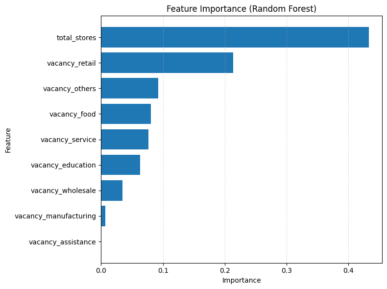 Vacancy features have low variance relative to ridership: vacancy counts are small (1–10 units) compared to large ridership ranges, causing Random Forest to prioritize higher-variance predictors